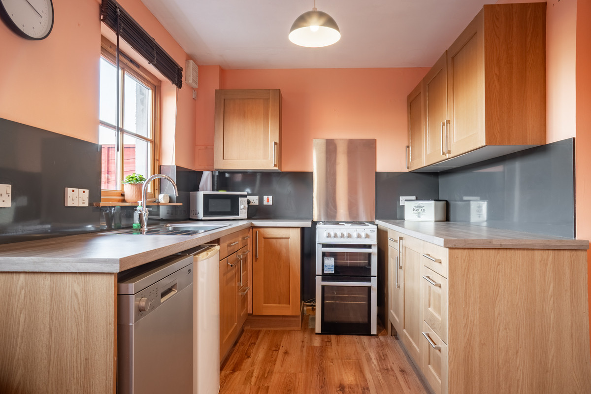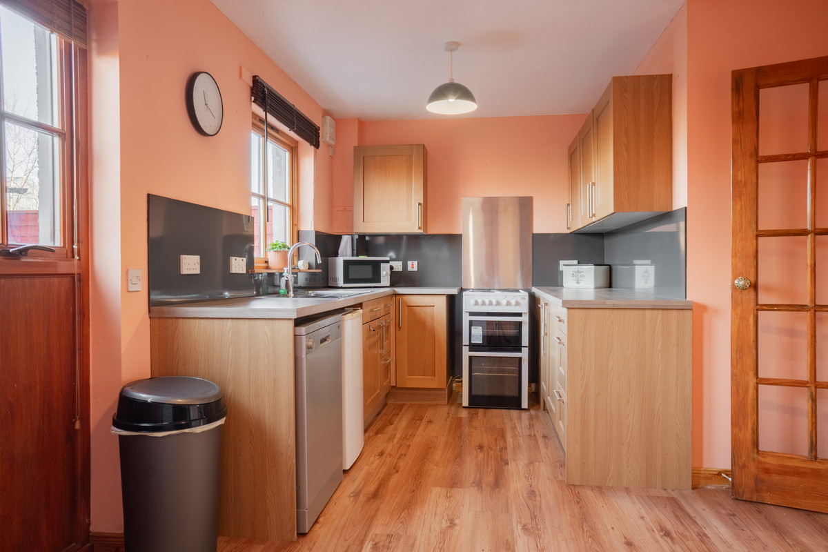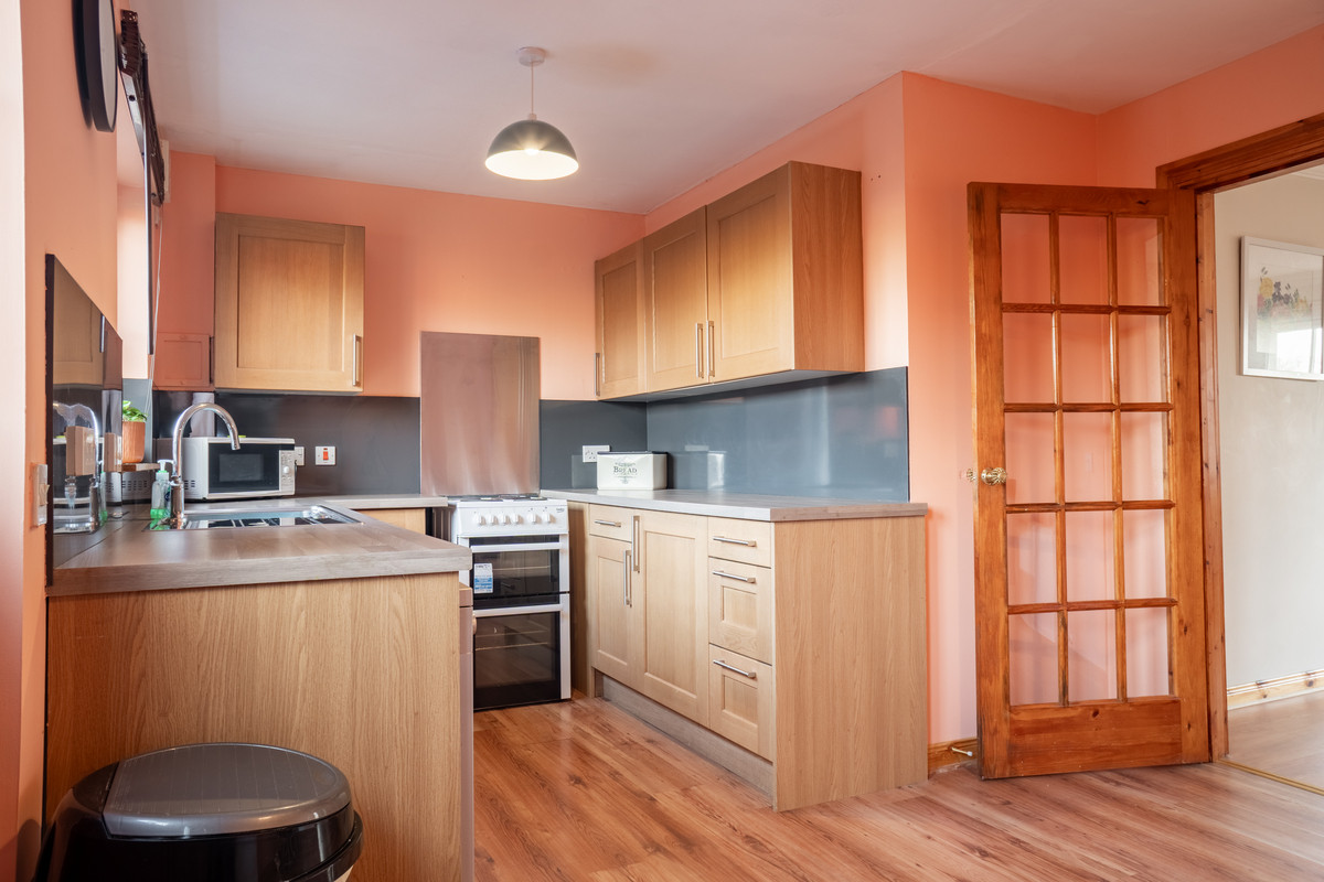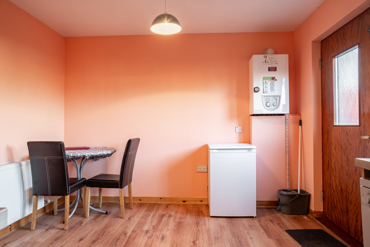 Through a connecting door lies the kitchen and dining room, a functional and stylish space designed to meet the demands of modern living. Light wood-coloured units with sleek chrome handles pair beautifully with the contemporary grey splashback panelling, creating a harmonious and practical workspace. The layout provides ample room for a freestanding cooker and washing machine, while the generous floor area easily accommodates a family dining table and chairs, making it an inviting hub for meals and social gatherings.