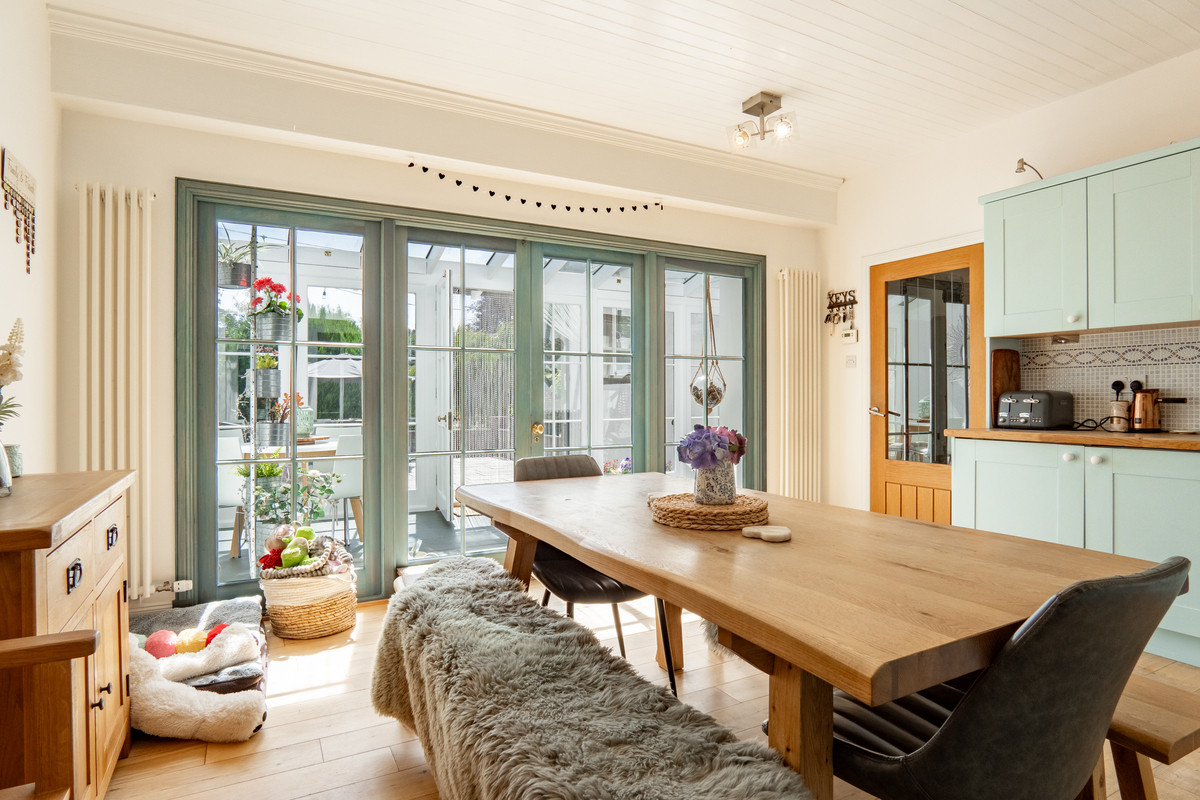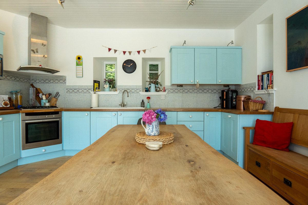 From here, you’re drawn into the kitchen which is a large and well-planned room with wooden flooring, stylish cabinets and solid wood worktops. Mosaic-style tiling in soft greys surrounds the worktop areas, adding texture and contrast. A white ceramic sink is set into the worktop while integrated appliances include a gas hob with extractor above and an oven positioned below. There’s ample space in the room for a full-sized dining table and chairs, making this a true heart-of-the-home kitchen.