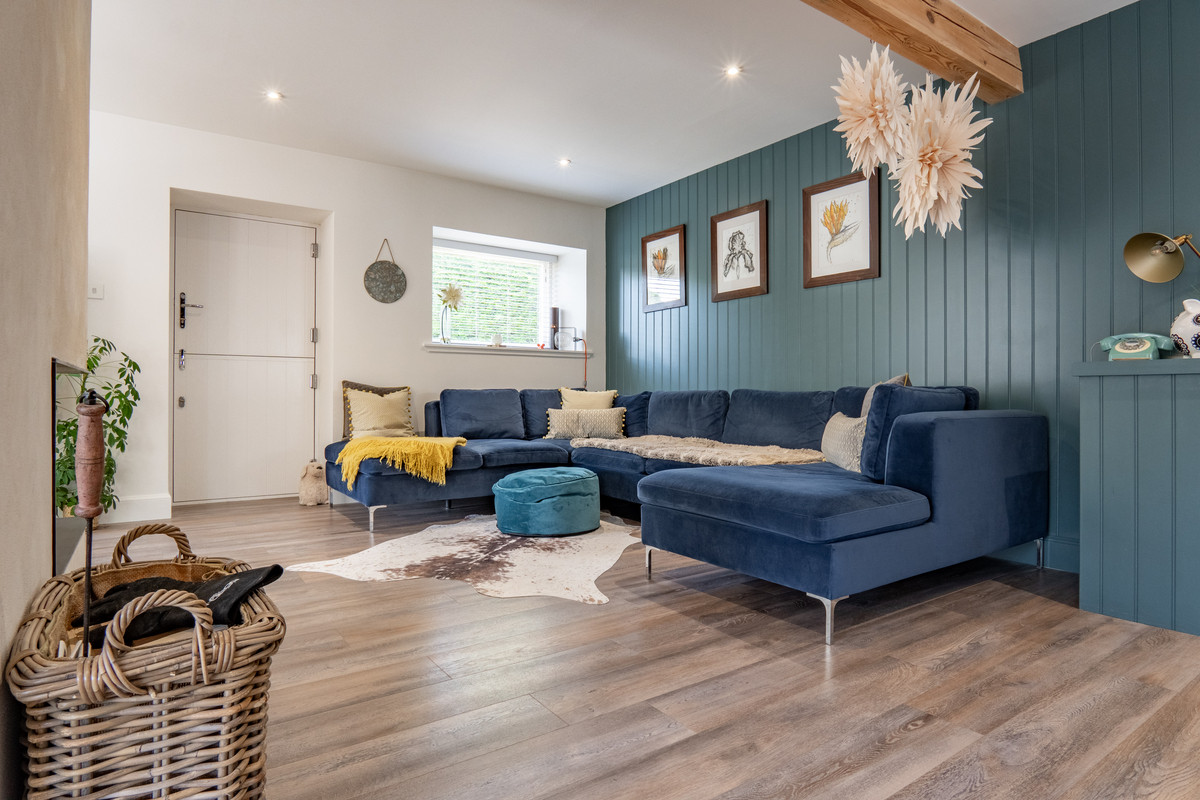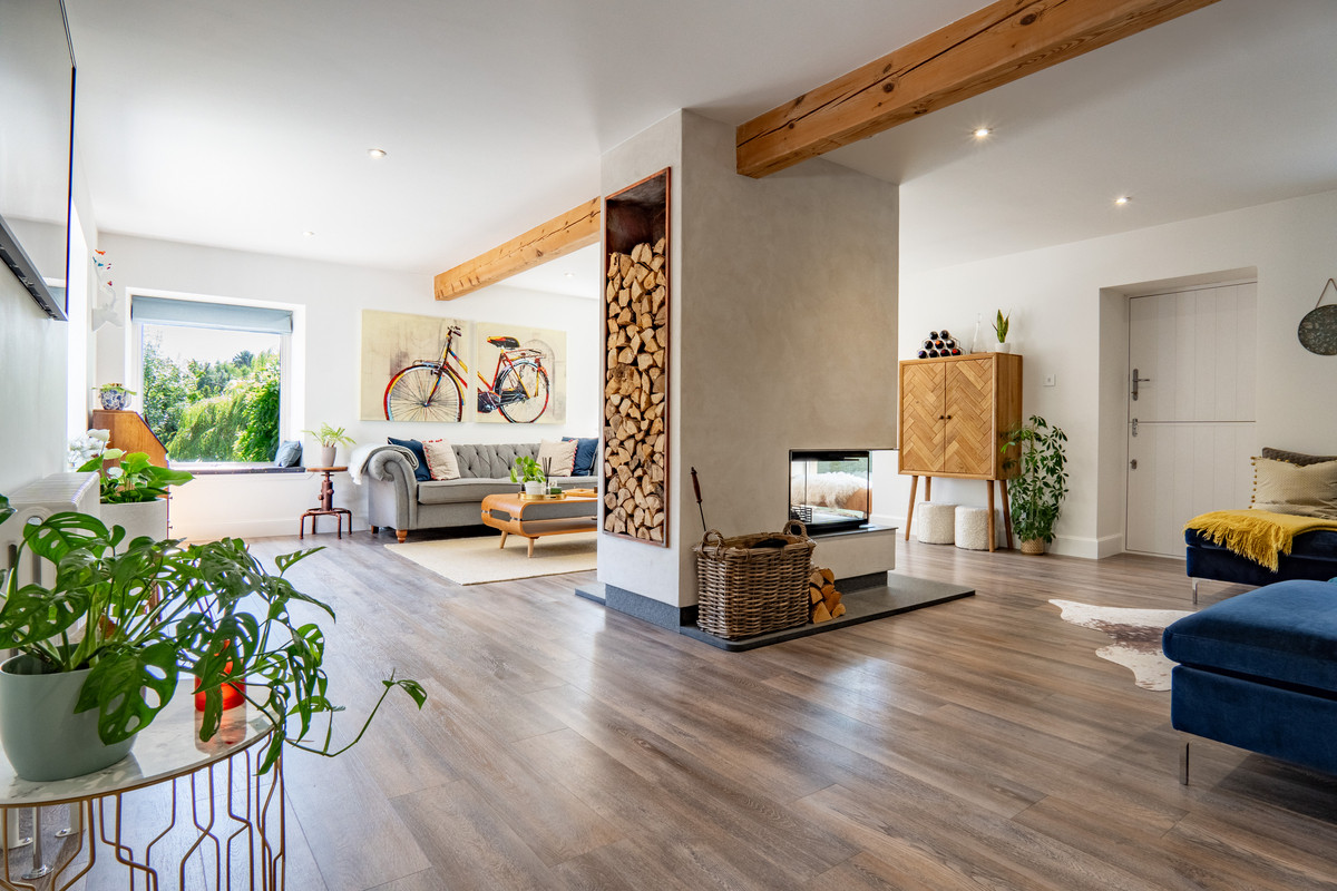 Finishing off the ground floor is the expansive living room, a large, adaptable space with striking design elements and real presence. At its heart stands an enclosed fire with a tall vertical flue, positioned centrally to divide and warm the space in equal measure. It creates a natural anchor point around which to gather, whether for cosy evenings or entertaining. Wooden flooring runs throughout, while a deep green panelled wall adds character and contrast to the crisp white walls elsewhere. Multiple generous windows draw in light from several directions, keeping the room bright and balanced throughout the day.