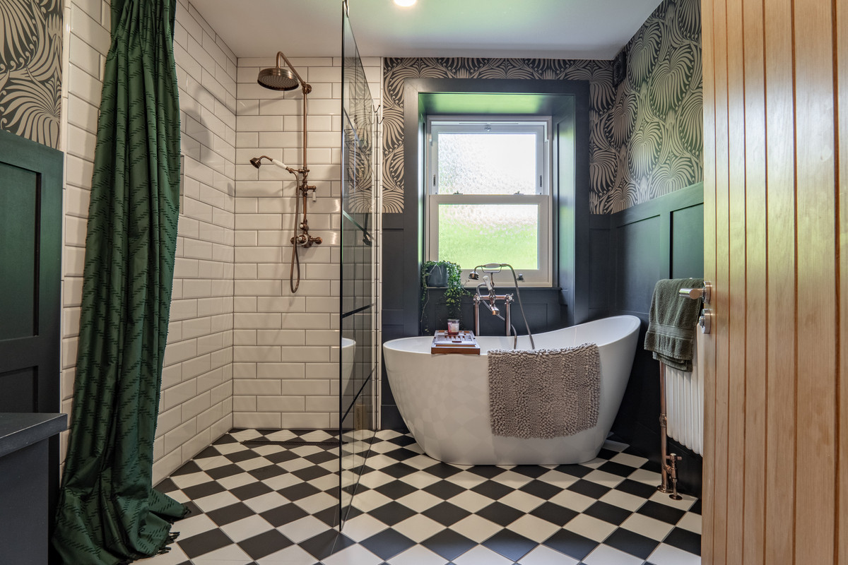 The family bathroom is bold and luxurious, combining a black-and-white contrast for maximum impact. Glossy white tiles line the large walk-in shower which enjoys a mixer shower with rainfall head, framed by a black-edged glass screen. Floor tiles in a classic chequerboard pattern add vintage flair, while painted black wainscot panelling elevates the style. Taking centre stage is a beautiful freestanding white bath with centrally mounted taps, a luxurious spot to unwind at the end of the day. Beside the bath stands a tall white radiator and a small, modern round basin is set atop a compact cabinet near the door. A window completes the room, providing natural light and ventilation.