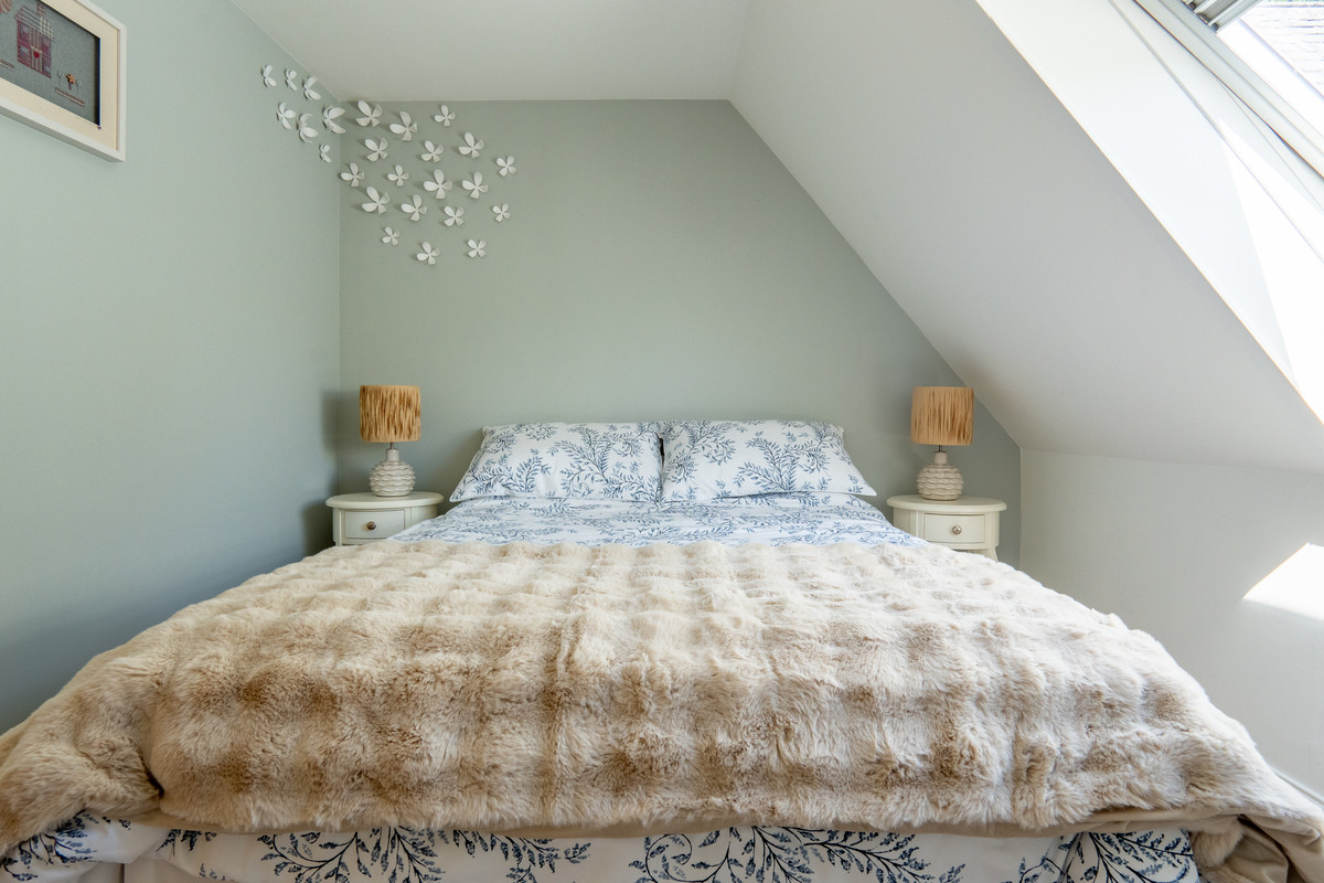 A second bedroom is a bright and inviting double room with a sloped ceiling and a Velux-style roof window. The decor combines soft white and light grey tones, creating a fresh and relaxed atmosphere. A traditional white radiator sits near the door and the layout provides ample space for a large bed and essential furnishings.