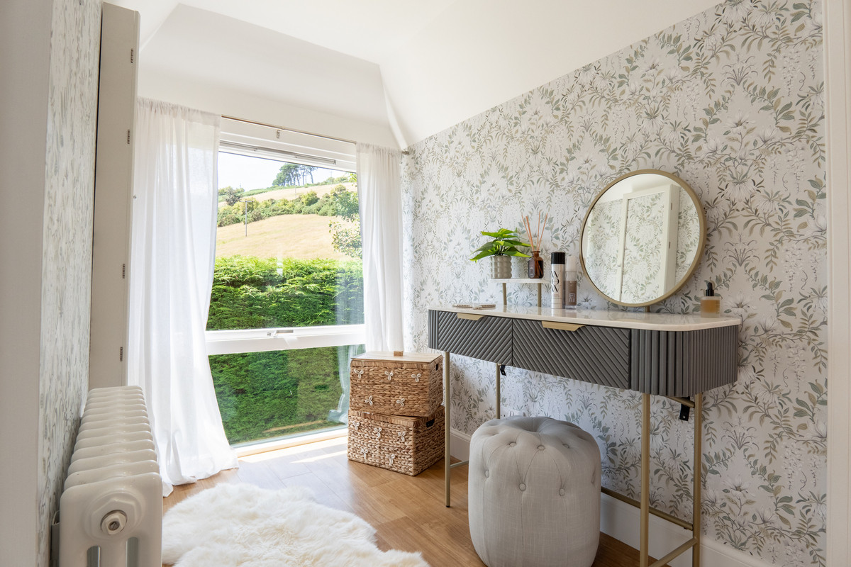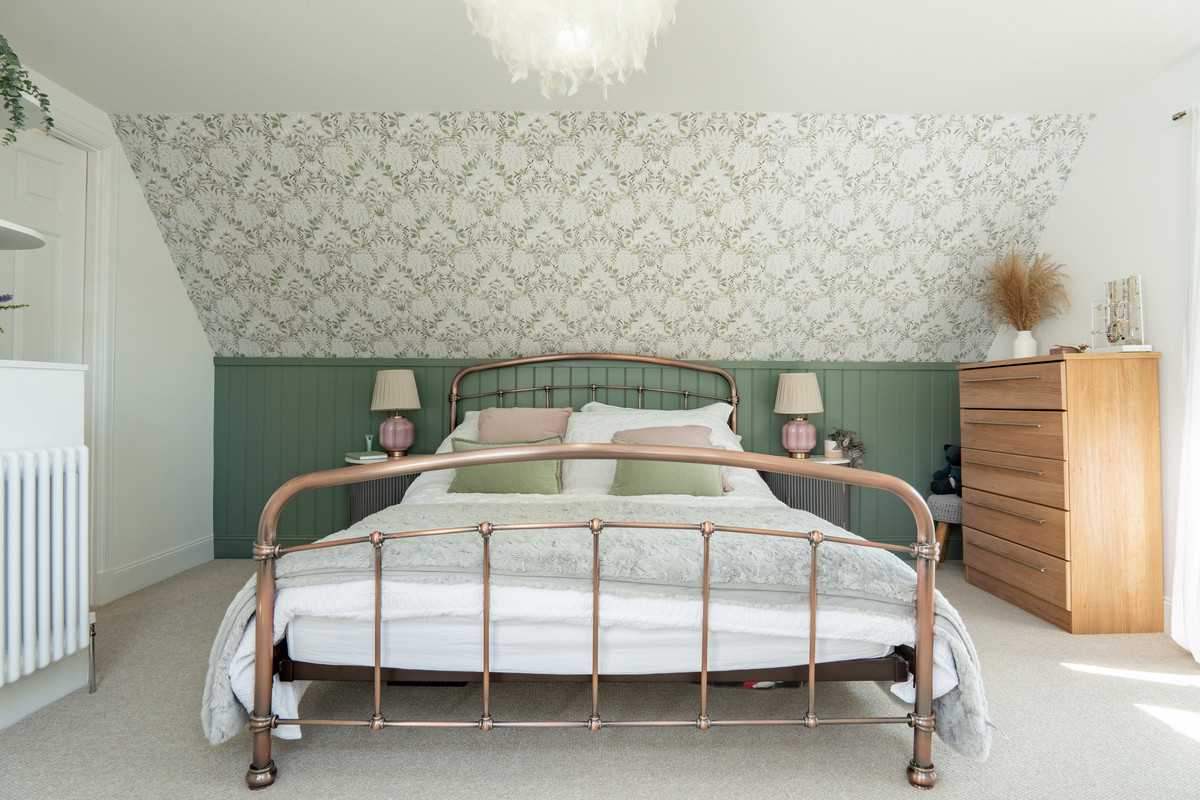 Upstairs, the landing connects to four generous bedrooms and a family bathroom, with a storage cupboard housing the Megaflo hot water cylinder. The master bedroom is a standout, large and bright with a Juliette balcony accessed by fully glazed French doors. Sloped ceilings with twin Velux windows and two built-in wardrobes either side give the room both character and practicality. One wall is finished in leafy-patterned wallpaper above green-painted panelling while the soft grey carpet adds calm and comfort. The en-suite shower room is equally attractive, featuring a corner shower cubicle with white and grey wet-wall panels and a stylish mixer shower. The pedestal basin and white toilet are all thoughtfully laid out, with wooden flooring underfoot and a small window adding natural light.