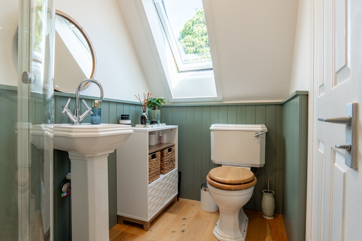 The fourth bedroom is particularly spacious, with a sloping ceiling that adds character and warmth. It features a large four-door wardrobe, providing superb storage and both a Velux-style rooflight and a small additional window to allow natural light to flow in. With its neutral decor and calming layout, it’s a restful and flexible space for guests or family.