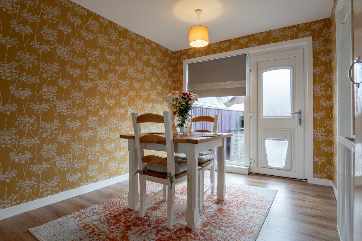The dining room features yellow wallpaper with a white floral design and carries through the same wooden flooring. There’s ample space here for a dining table and chairs, with both a full-height window and a white glazed door leading directly to the garden, bringing in natural light and creating a pleasant connection to the outdoors.