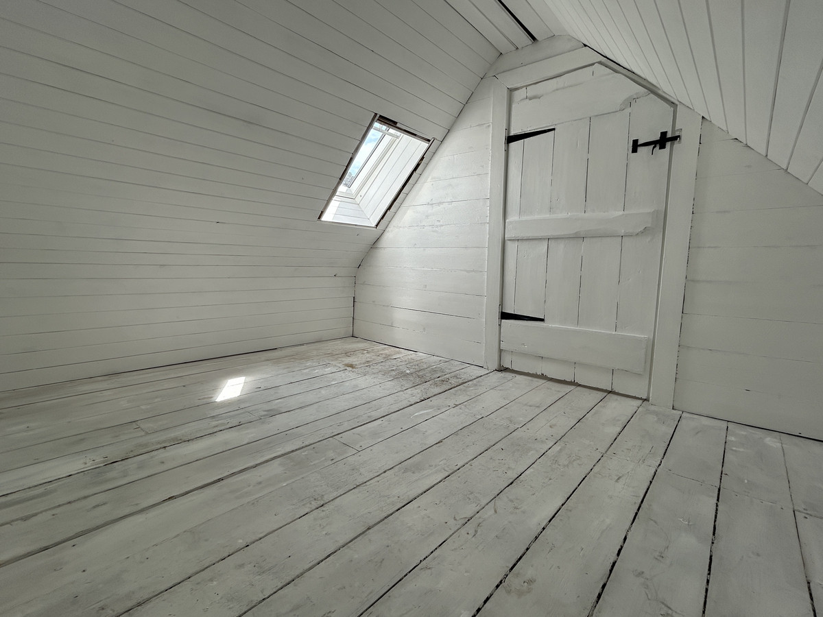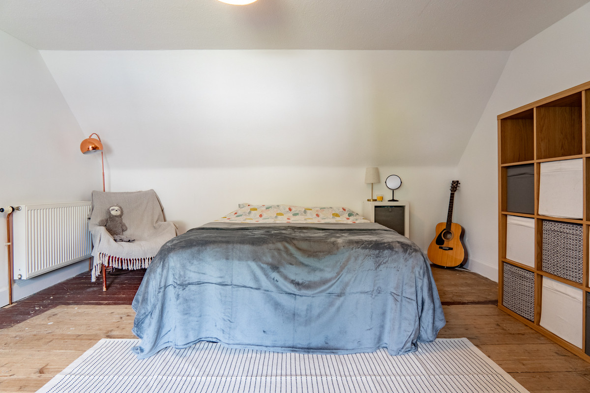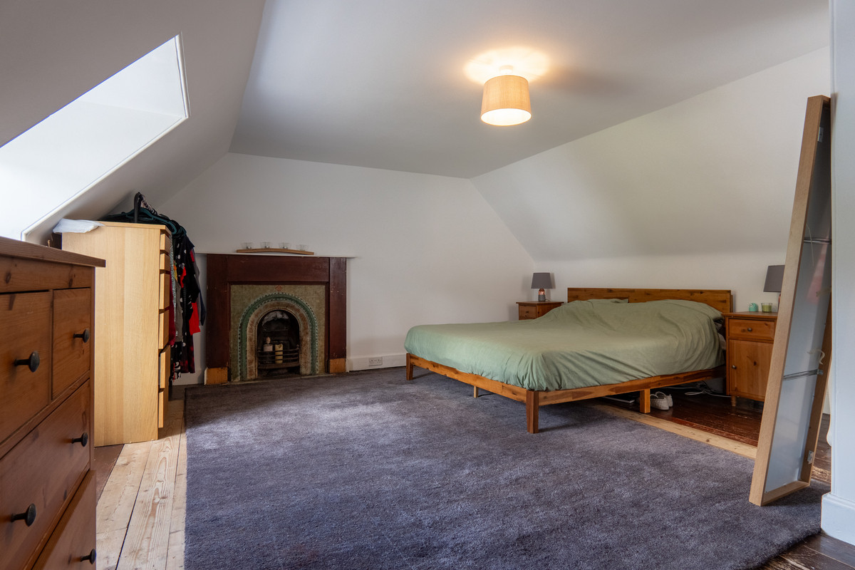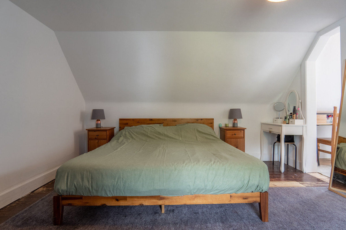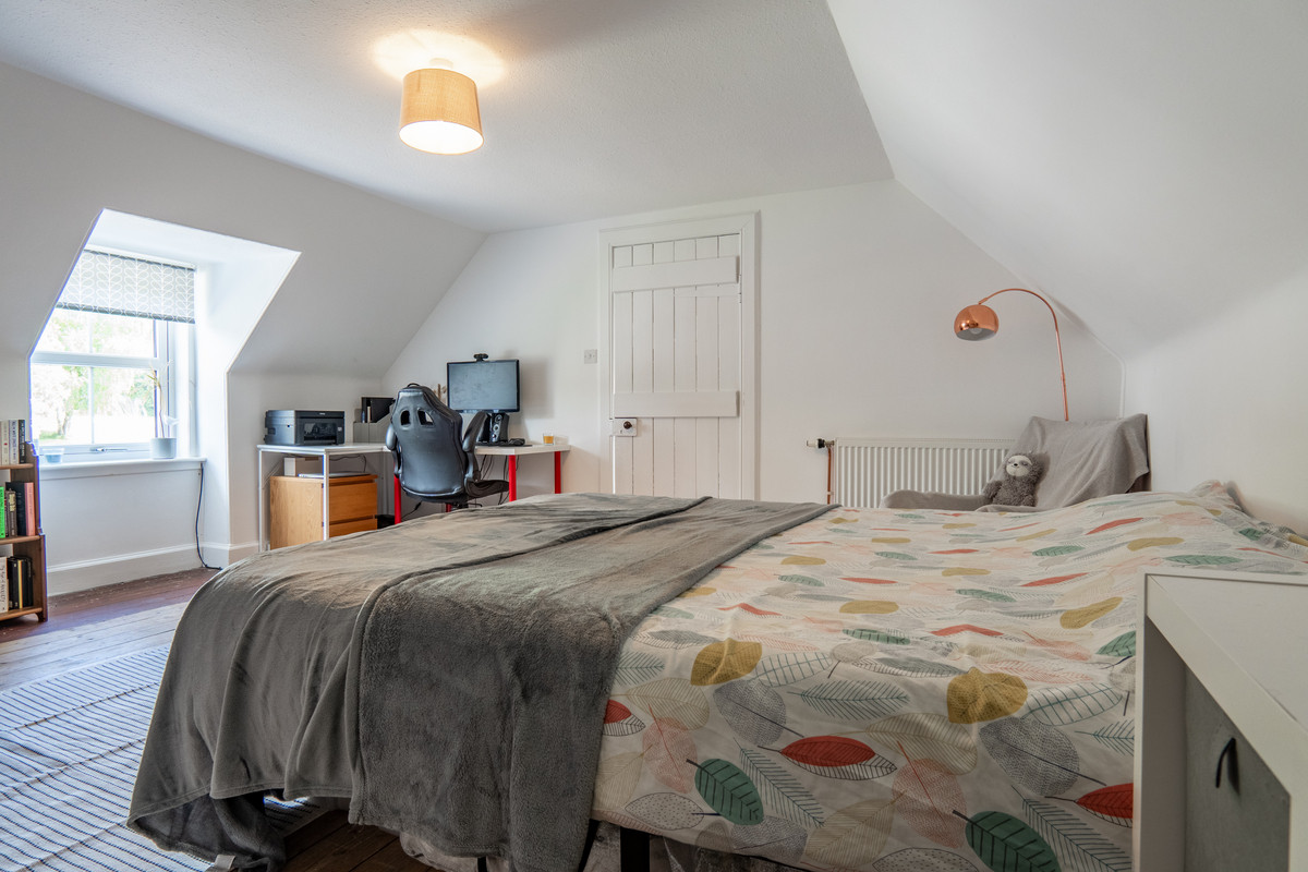 The second bedroom is equally impressive in size. Wooden flooring adds warmth and a rustic painted door nods to the building’s age. A dormer window provides open views across the fields, while the size allows for large furniture and a comfortable sleeping area.