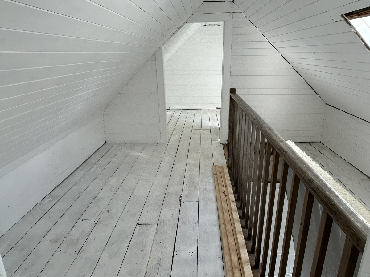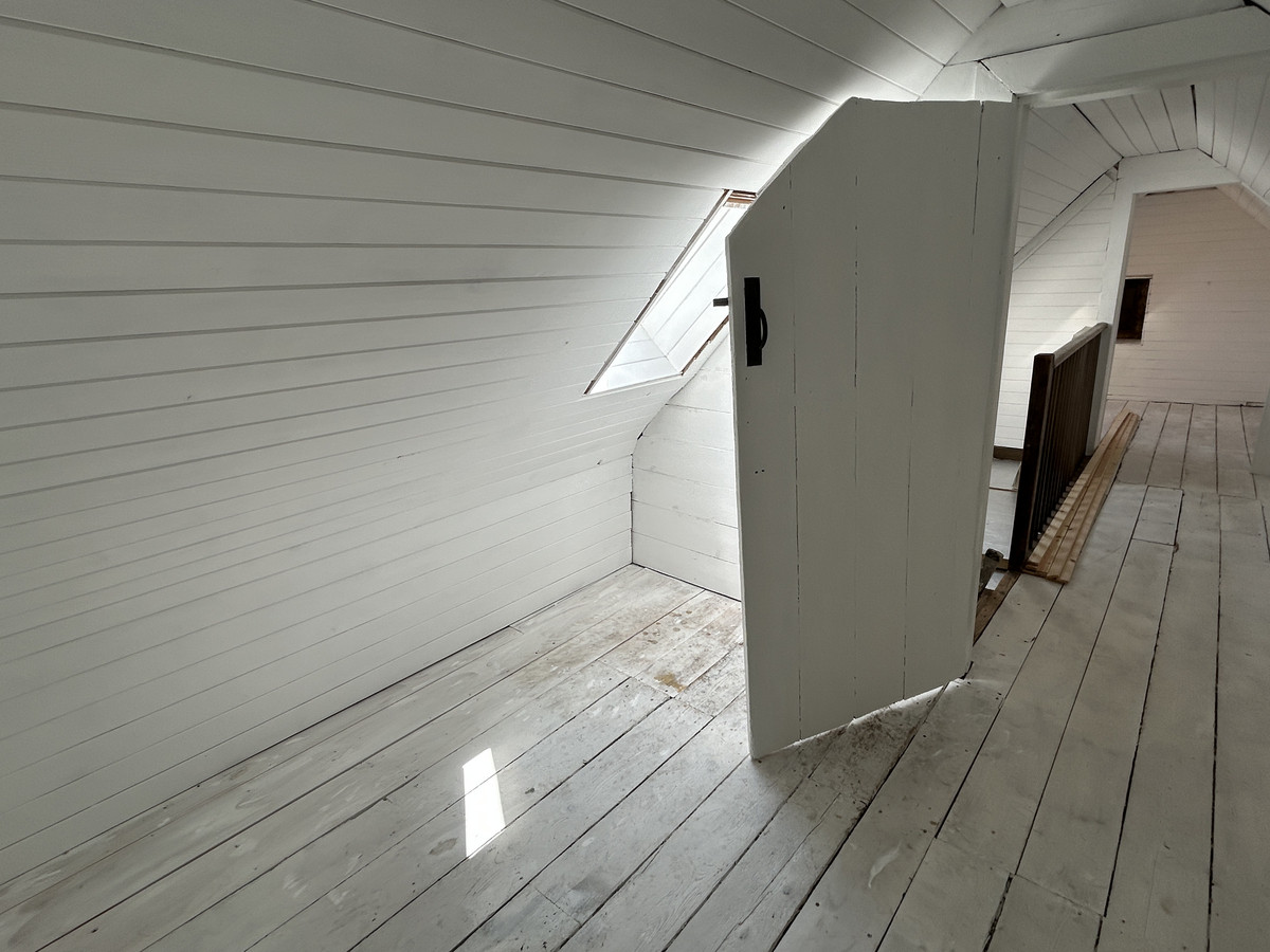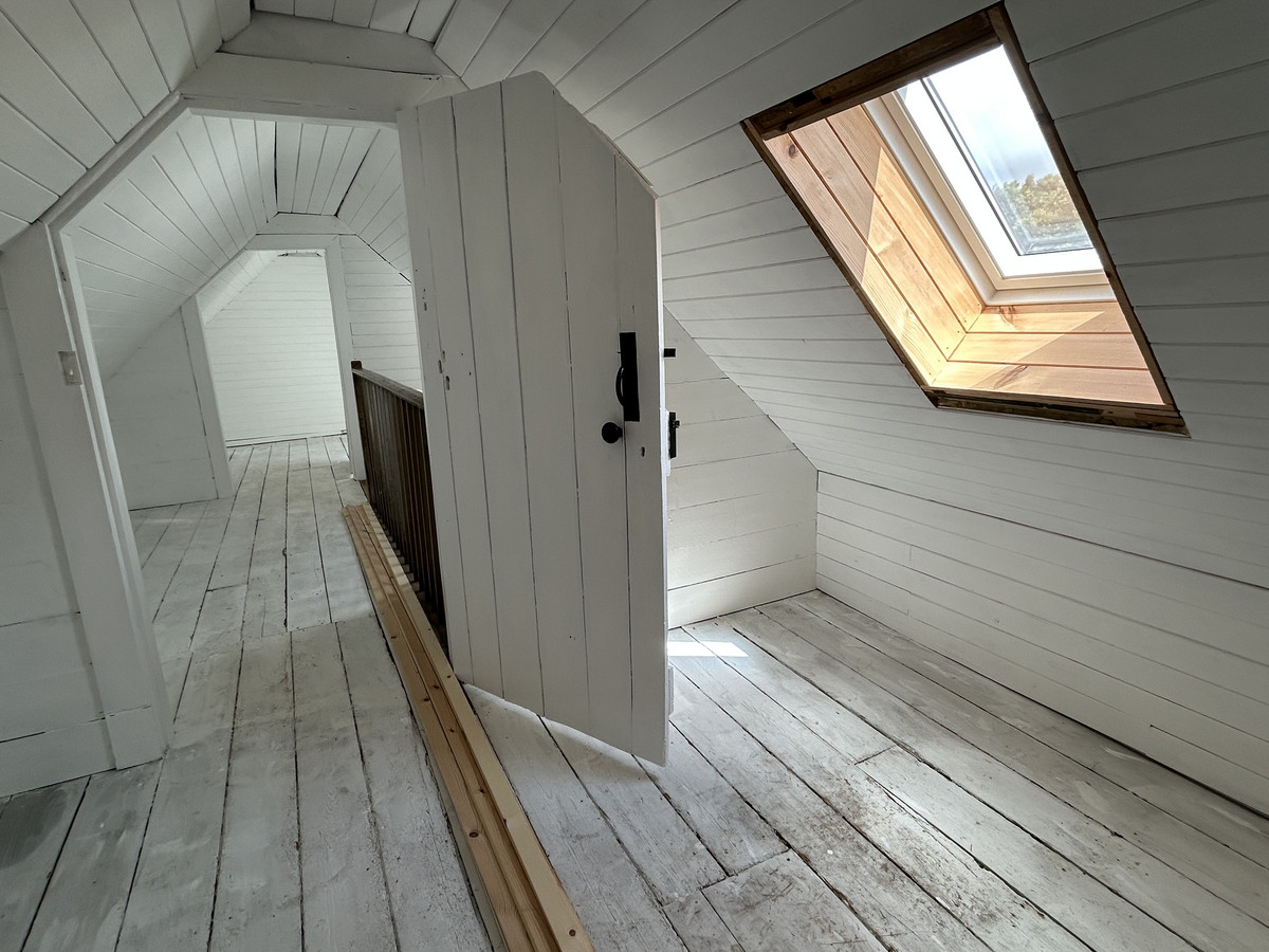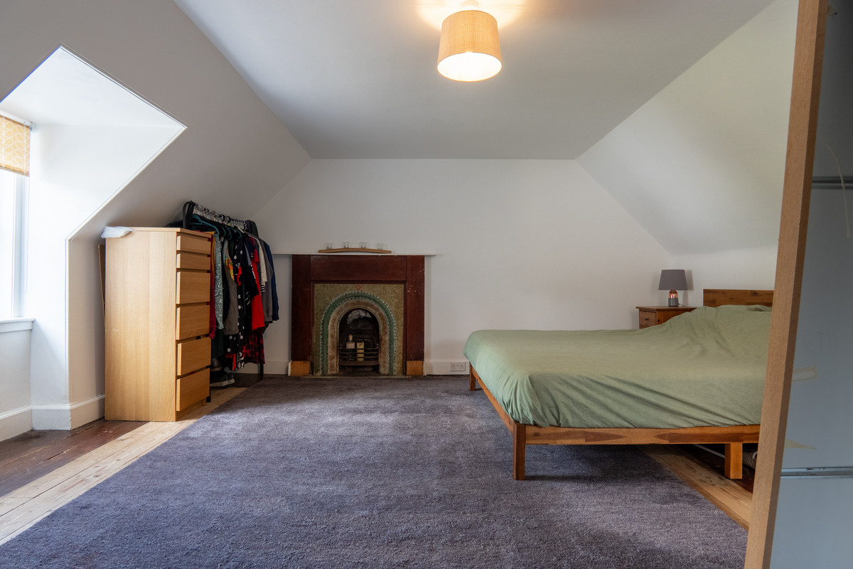 The second bedroom is equally impressive in size. Wooden flooring adds warmth and a rustic painted door nods to the building’s age. A dormer window provides open views across the fields, while the size allows for large furniture and a comfortable sleeping area.