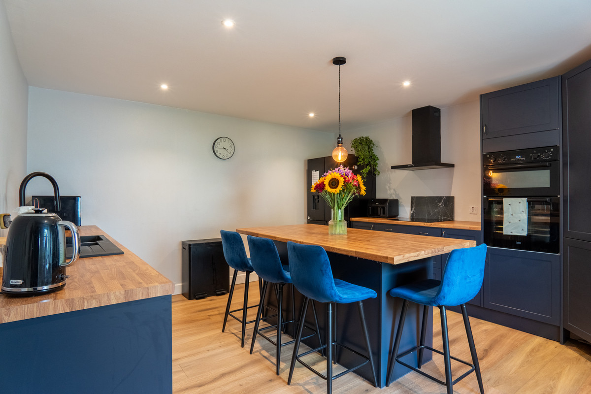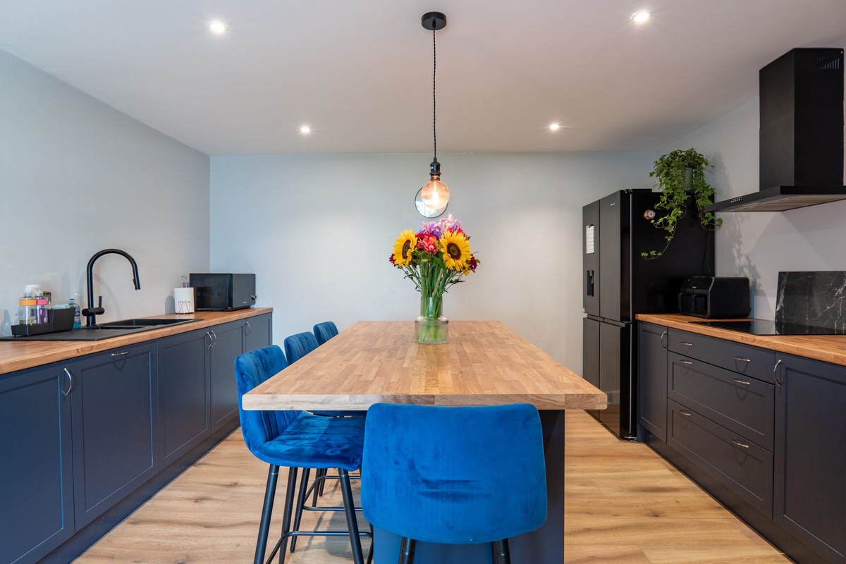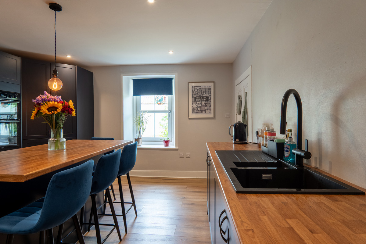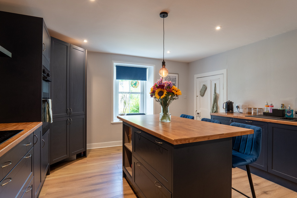 Step through the enclosed front porch and into the hallway, where the character of this traditional home starts to unfold. Off to one side, is the kitchen and dining area. This is a bright, spacious room that blends country styling with a contemporary edge. Rich navy-blue cabinets contrast beautifully with the solid timber worktops while a central island offers extra surface space and casual seating. Integrated appliances include a double oven at eye level, a sleek electric hob with extractor above and a dark composite sink with modern black tap. Ceiling spotlights and wood flooring complete the room’s well-balanced, practical layout.