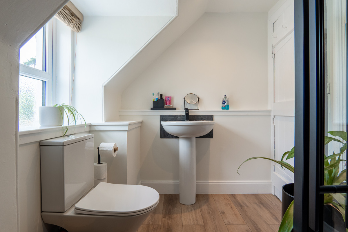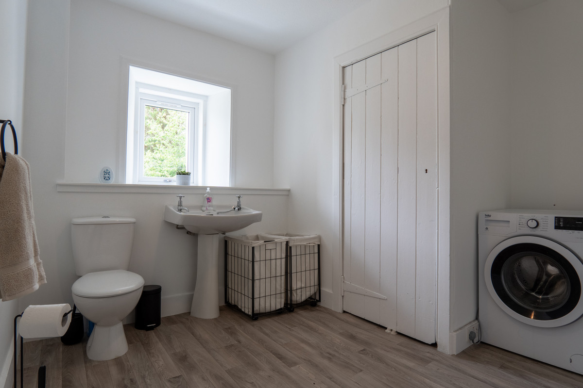 The home also has a cloakroom WC that’s neatly finished in white décor and also provides space for laundry appliances. A built-in storage cupboard helps keep the everyday essentials tucked away. A separate utility room adds further convenience for laundry and storage needs, keeping the main living areas uncluttered and practical for everyday life.