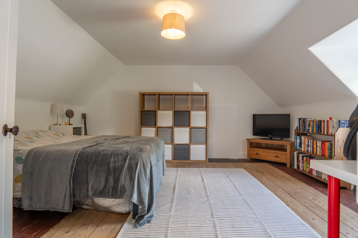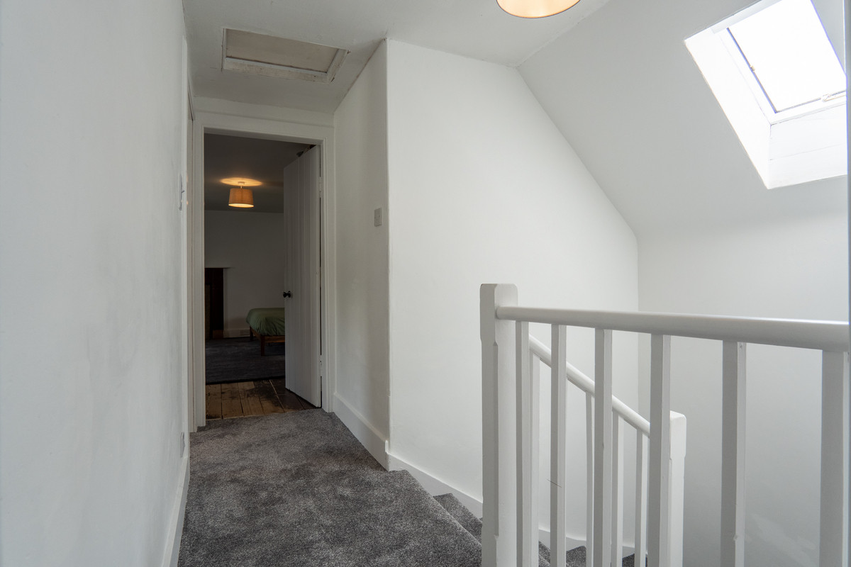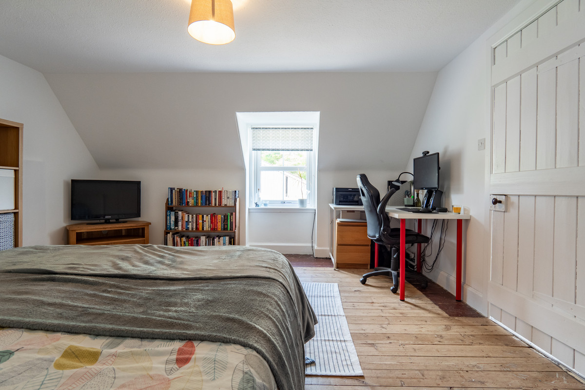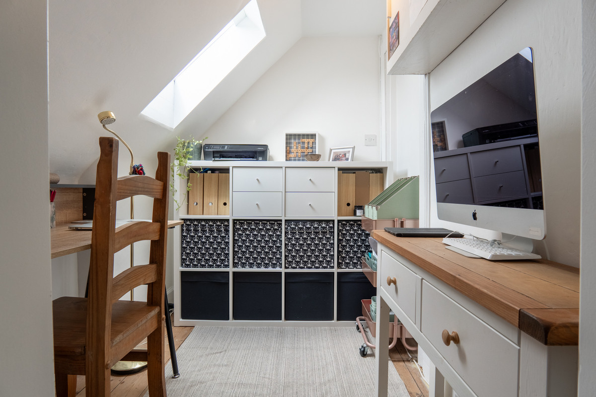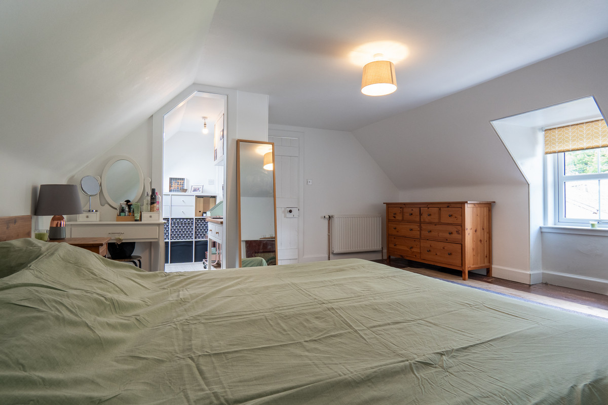 Upstairs, the landing is fitted with the same thick grey carpet and connects the upper rooms. The first bedroom is a bright, spacious room with white-painted walls, a dormer window and sloped ceilings that reflect the home’s character. A separate study leads directly from this bedroom which is a great addition. It’s currently set up for home working with a computer desk and storage but could easily be adapted for use as a dressing room, walk-in wardrobe or reading nook. A roof window above adds natural light, making the space feel open and adaptable.