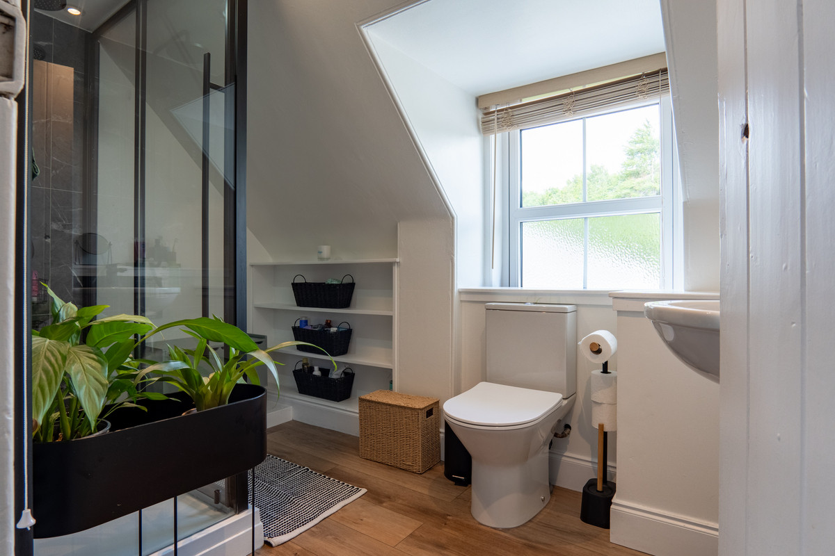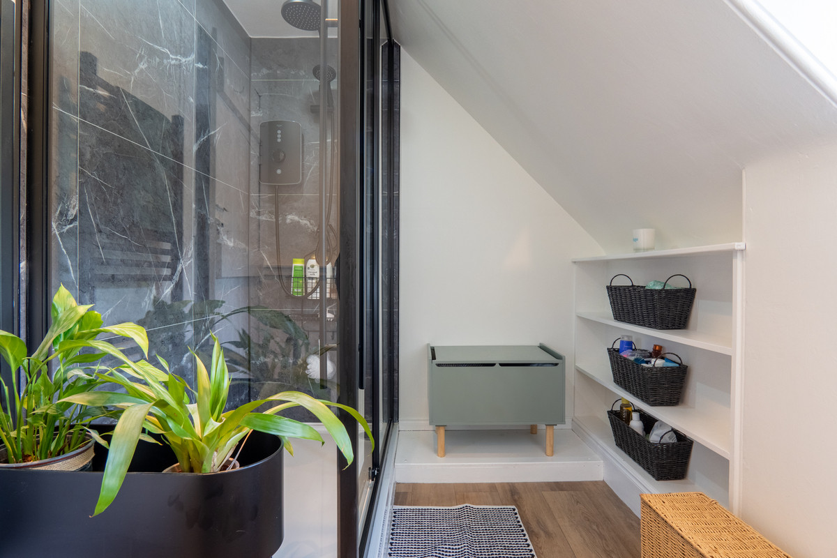 The upstairs shower room has been updated with striking modern finishes. A black-trimmed shower enclosure houses an electric shower, set against dark marble-effect wall panels. A white sink and toilet are complemented by built-in shelving for storage while the wooden floor ties everything together with natural texture.