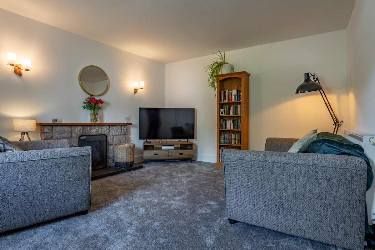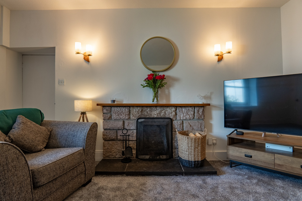 The lounge offers a comfortable, inviting space with thick grey carpet underfoot, neutral walls and a small window that draws in light. A stone-effect fireplace with wooden mantel forms a cosy centrepiece, housing an open fire that adds warmth and rustic charm.