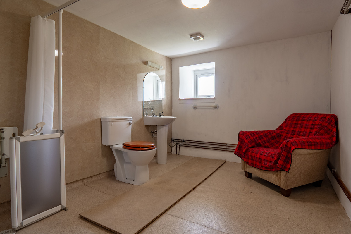 Also on the ground floor, a wet room provides accessible washing facilities, fitted with mobility aids, a walk-in shower, toilet and basin. With a bit of vision, it could be reworked into a striking bathroom, with all the foundations already in place.