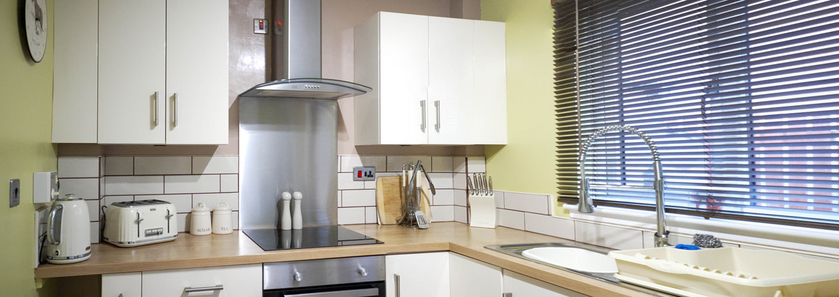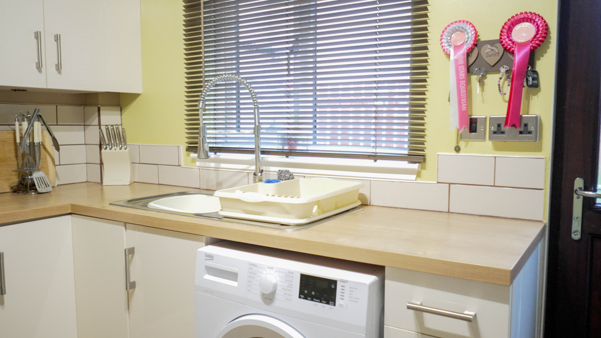To the rear, the kitchen is fitted with light-coloured units, chrome handles and wood-effect worktops. Integrated appliances include an oven, electric hob and extractor fan, while a stainless steel sink with modern flexi-hose tap sits beneath the rear window. White tiling wraps around the worktop areas and cream-painted walls completes the look. Laminate flooring runs underfoot and a back door opens directly into the garden.