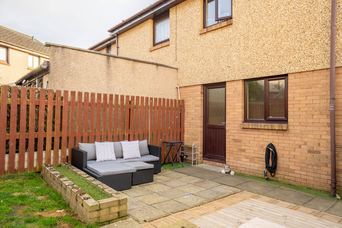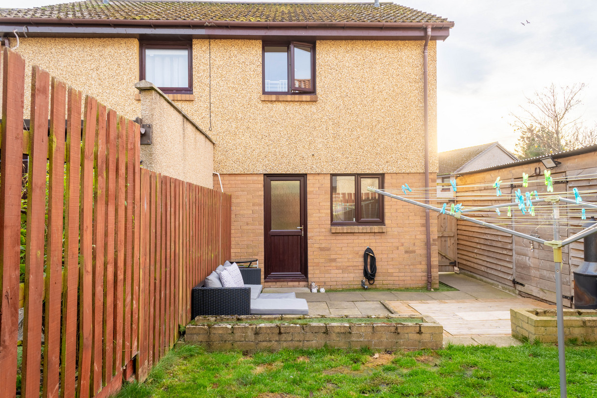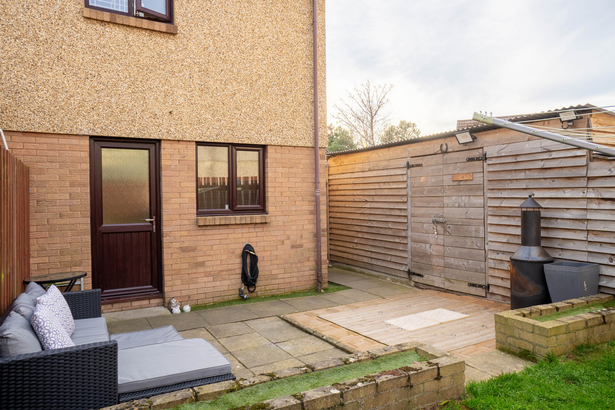 The back garden includes a paved seating area just outside the rear door with a small lawn beyond, all enclosed by timber fencing. A timber shed is positioned to the side of the house, offering useful outdoor storage without dominating the garden space.