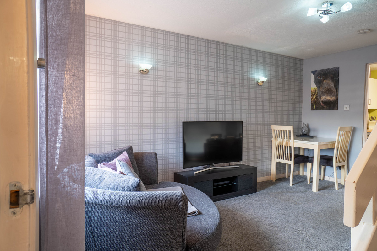 Inside, the lounge is painted light grey with a feature wall of tartan-style wallpaper in light grey and white tones. The open tread staircase in the room adds character while maintaining a sense of space, while the front-facing window brings in natural light. The room’s dimensions provide plenty of space for sofas and media units and also currently accommodates a small dining and chairs.