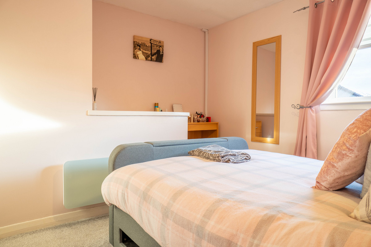 Upstairs, the landing leads to two double bedrooms and a bathroom. One bedroom features a built-in wardrobe with triple mirrored sliding doors, plus a separate cupboard for extra storage. Walls are painted in cream with a single striped feature wall and there’s an electric heater for warmth. The second bedroom includes a textured feature wallpaper wall and offers space for a bed and furnishings, with a window facing the front.